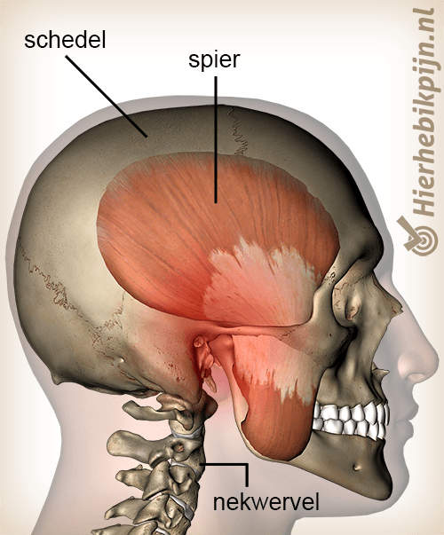 Vanuit de nek lopen verschillende spieren naar het hoofd toe. Deze zorgen ervoor dat we het hoofd in alle richtingen kunnen bewegen. In het hoofd zelf bevinden zich ook nog een hoop spieren waarmee we onder andere het gezicht, de ogen en de kaken kunnen bewegen. Van en naar de hersenen toe lopen bloedvaten, zenuwbanen en het ruggenmerg. De bloedvaten zorgen ervoor dat het hoofd en de hersenen van zuurstof en voedingsstoffen worden voorzien. De zenuwen en het ruggenmerg vervoeren en verwerken informatie die van het lichaam afkomstig. Zo kunnen we spieren aansturen en pijn waarnemen. Verschillende soorten hoofdpijn Wanneer spieren (langdurig) te strak gespannen staan kan dit leiden tot zogenaamde spanningshoofdpijn. De pijn kan ook afkomstig zijn vanuit een probleem met de zenuwen in de nek. Dat is bijvoorbeeld het geval bij cervicogene hoofdpijn. Hoofdpijn die ontstaat door migraine of medicijngebruik komen ook vaak voor. Clusterhoofdpijn kan hevige pijnscheuten rond het oog veroorzaken. Hoofdpijn rondom het oor kan het gevolg zijn van een slecht functionerend kaakgewricht.