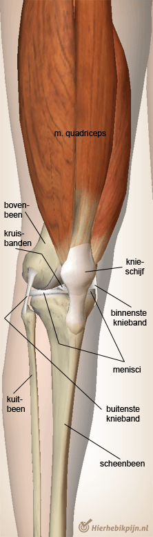 De spier die vanuit de heup aan de voorkant van het bovenbeen loopt en vervolgens via een peesconstructie met de knieschijf op het onderbeen aanhecht, is de musculus quadriceps. Deze spier heeft als functie de knie te strekken.