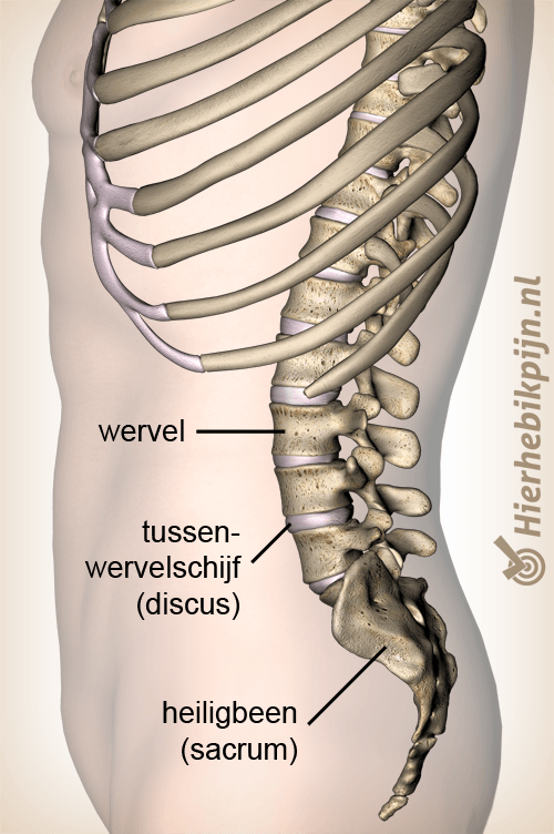 Tussen de wervels bevinden zich tussenwervelschijven. Deze flexibele schijven zorgen voor demping en beweeglijkheid van de rug. In de onderrug bevindt de laatste tussenwervelschijf zich tussen de onderste lendenwervel en het heiligbeen. Een wervel is een botstructuur die uit een wervelboog en twee gewrichtsuitsteeksels bestaat.
